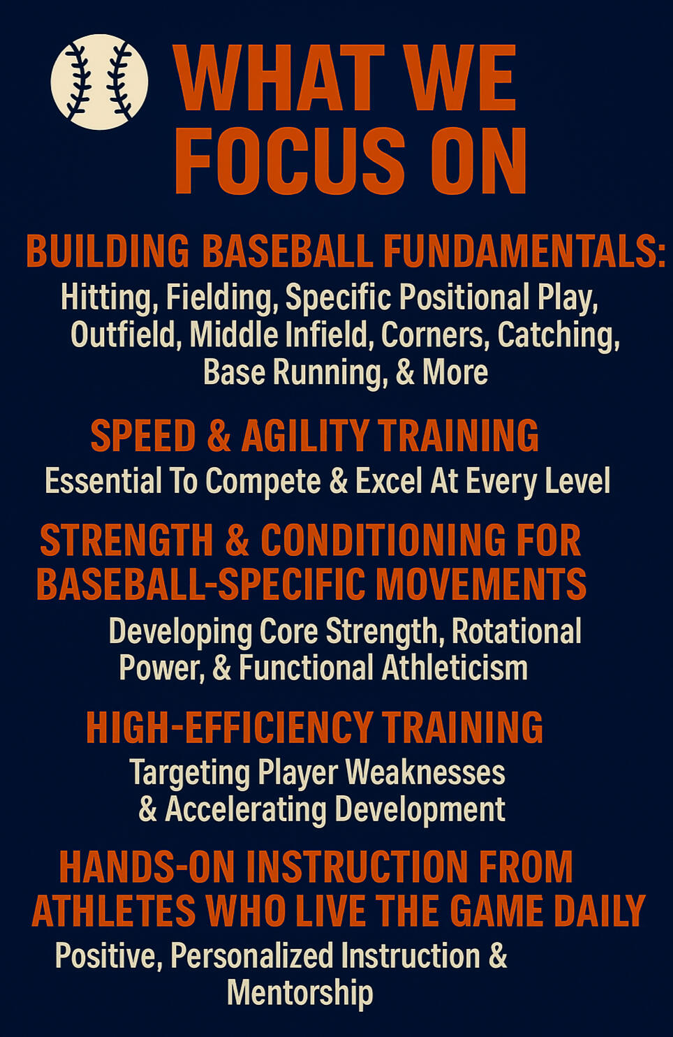The After-School Development Program Is Built Around Consistent, High-Frequency Training In A Small-Group Environment. Athletes Train Multiple Days Per Week Using A Structured Approach That Allows Coaches To Teach, Correct, & Progress Each Player Over Time. Baseball-Specific Strength & Speed Development Is Integrated To Support Durability, Movement Efficiency, & On-Field Performance, While Daily Baseball Training Emphasizes Skill Repetition, Game Awareness, & Long-Term Competitive Growth. This Approach Allows Athletes To Develop At A Steady, Sustainable Pace Without Disruption Or Constantly Resetting From Session To Session.